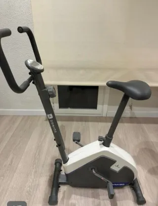 Bicicleta estática de la marca DOMYOS, modelo EB120. Diseñada para entrenamientos en casa. No se ha usado nada. - Color negro. - Soporte para botella. - Ruedas para facilitar el transporte.