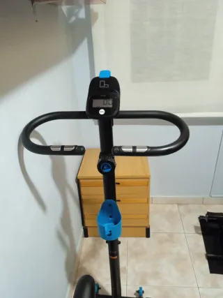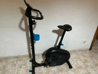 Bicicleta estática Domyos 120 en color negro, en excelente estado. - Diseño compacto y moderno. - Portabidón azul integrado. - Ruedas para facilitar su transporte.