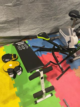 Equipo de gimnasio para entrenar en casa. Incluye banco de pesas, guantes y manoplas. - Banco de pesas con acolchado. - Guantes de entrenamiento WFX. - Manoplas de boxeo. - Bicicleta estática Pro-Form.