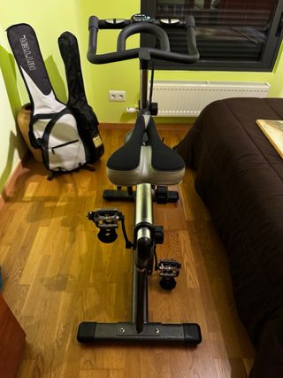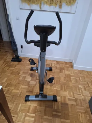 Ideal para entrenamientos en casa. El envio corre por cuenta del comprador Características principales: • Volante de inercia de 25 kg • Resistencia regulable • Sillín y manillar ajustables en altura • Pedales con correas • Estructura sólida y estable, uso doméstico • Funcionamiento correcto y silencioso Extras incluidos: • Forro acolchado para el asiento (memory foam), mucho más cómodo que el sillín original Estado y detalles: • La bici funciona correctamente • Uso normal • Detalle a tener en cuenta: las ruedas de transporte delanteras están deterioradas (ver fotos)
