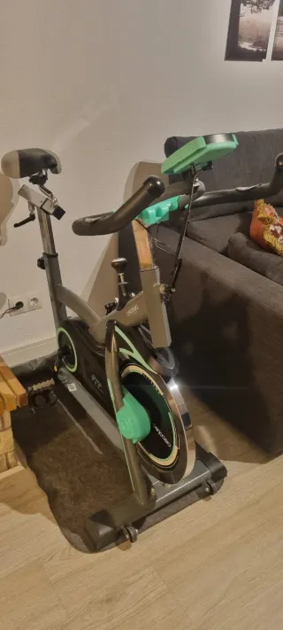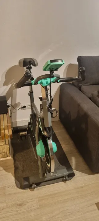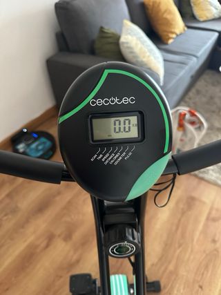 Bicicleta estática de la marca Cecotec, ideal para entrenamientos en casa. - Color negro con detalles en verde azulado. - Sillín ajustable. - Manillar ergonómico. perfectamente funcionante se vende por falta de uso