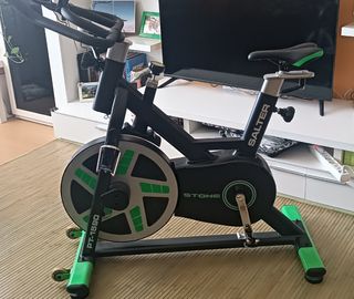 Bicicleta de spinning Salter PT-1590 en color negro y verde. - Diseño robusto y estable. - Rueda de inercia de gran tamaño. - Pedales con correas. - Asiento ajustable. Regalo pedales automáticos y soporte para móvil o tablet. El anclaje de la consola se rompió y está sujeto con bridas como se ve en las imágenes pero la bici está como si nunca se hubiera usado. Conservamos el tiquet de compra del corte inglés.