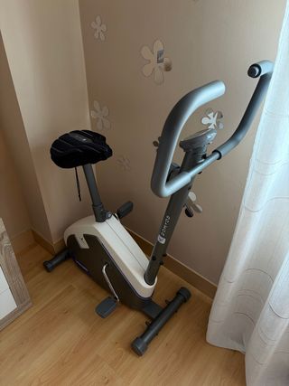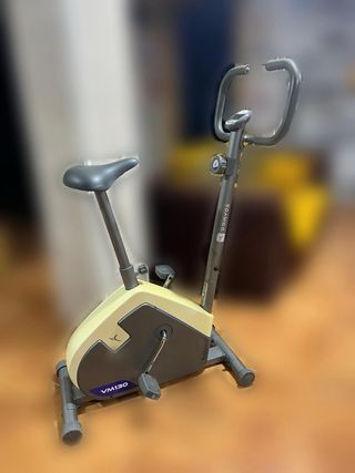 Bicicleta estática Domyos VM 150, ideal para entrenamientos en casa. Su diseño compacto la hace perfecta para cualquier espacio. - Muy buen estado. - Manillar ergonómico. - Sillín ajustable. - Pedales con correas de sujeción. - Pantalla digital para seguimiento de datos. - Precio 70€