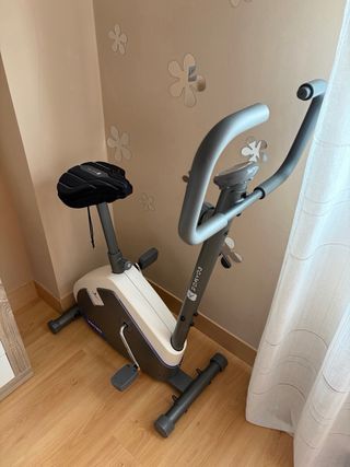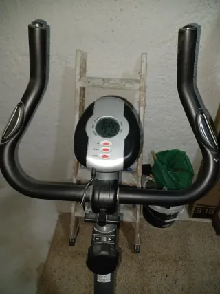 Bicicleta estática en buen estado, ideal para hacer ejercicio en casa. - Monitor digital que muestra el tiempo, la velocidad y las calorías quemadas (el display tiene algún fallo) - Resistencia regulable para ajustar la intensidad del entrenamiento. - Asiento cómodo y ajustable. - Pedales antideslizantes para mayor seguridad.