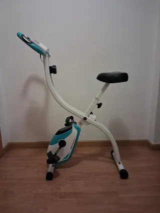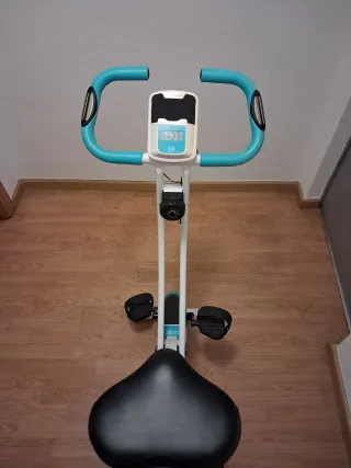 Bicicleta estática Ultrasport F-Bike plegable casi sin uso prácticamente nueva, ideal para entrenar en casa. - Diseño plegable para fácil almacenamiento. - Pantalla digital con información de entrenamiento. - Color blanco y turquesa. - Manillar con agarres cómodos. - Sillín acolchado.