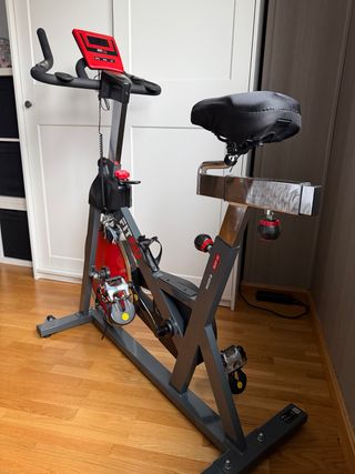 Bicicleta de spinning para entrenamientos en casa. Diseñada para ofrecer una experiencia de ciclismo indoor. - Estructura robusta de color negro y rojo. - Sillín acolchado ajustable. - Manillar ergonómico. - Pedales con correas. - Pantalla digital para seguimiento de métricas.