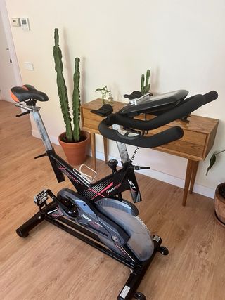 Bicicleta spinning para gimnasio de marca Bodytone, modelo: EX 3 - Diseño robusto y estable. - Manillar ajustable. - Sillín ergonómico. - Resistencia regulable. 125 × 60 × 105 cm Peso solo de la bici: 61kg Peso máximo que aguanta: 150kg La silla tiene 13 posiciones verticales diferentes Tiene 3 años, Pero la usamos muy poco como mucho no la usamos más que 20-25 veces, Esta casi nueva Na hacemos envios desde wallapop ya que pesa 61kg