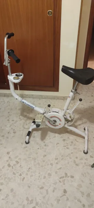 Bicicleta estática vintage de la marca Cyclostatic. Un clásico para entrenar en casa. - Estructura de metal blanco. - Sillín negro ajustable. - Manillar cromado con puños negros. - Pedales con correas.