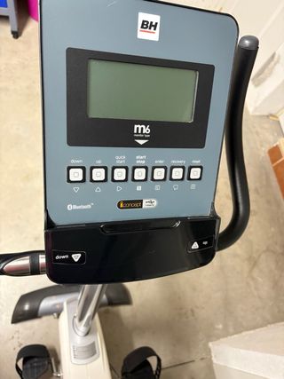 Bicicleta estática de la marca BH, modelo M6. - Pantalla LCD con información de entrenamiento. - Conectividad Bluetooth. - Botones de control: down, up, quick start, start/stop, enter, recovery, reset. - Puerto USB para carga o conexión.