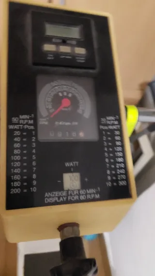 Bicicleta estática con pantalla digital para monitorizar tu entrenamiento. - Pantalla LCD con información de RPM, WATT y tiempo. - Indicador de WATT con escala de 100. - Tabla de conversión de RPM a WATT. - Diseño compacto y funcional.