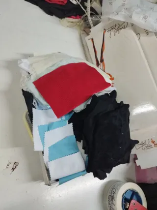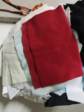 Lote de retales de tela de diferentes colores y texturas, ideales para proyectos de manualidades y costura. - Retal de tela rojo - Retales de tela blanco y azul - Retal de tela negro - Otros retales de diferentes colores