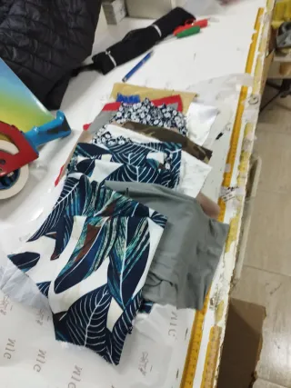 Se venden 10 retales de tela para manualidades. Ideales para patchwork, costura o cualquier proyecto creativo. Son de diferentes colores y texturas, algunos con apariencia suave. - Medidas variadas. - Colores: beige, blanco, marrón, negro, verde claro. - Perfectos para tus proyectos de costura.