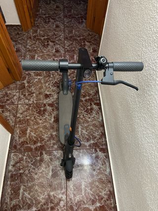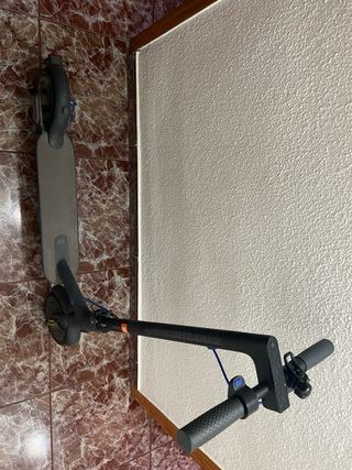 Patinete eléctrico de color negro con detalles en gris. - Plataforma con superficie antideslizante. - Rueda delantera y trasera. - Manillar con puños. -700km. -El freno funciona pero se recomienda cambiarlo. -Con rueda de repuesto.