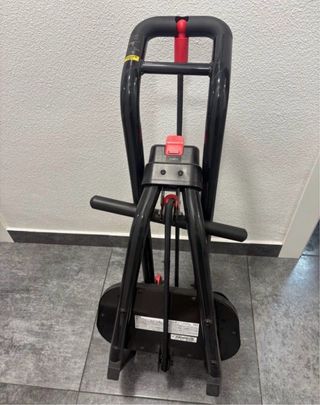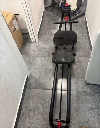 Máquina de Remo para el hogar, diseñada para ser compacta y fácil de guardar. - Estructura principal de metal negro. - Detalles en color rojo. - Diseño plegable para optimizar espacio.