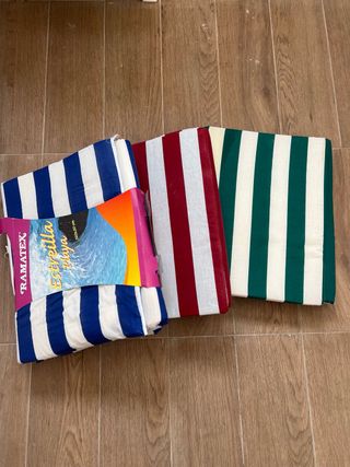 Conjunto de esterillas de playa con diseño a rayas. - Esterilla azul y blanca. - Esterilla roja y blanca. - Esterilla verde y blanca. - Incluye etiqueta de la marca Ramatex. 5€ cada una o 12€ todas