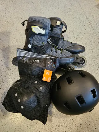 Conjunto completo para patinar de forma segura. Incluye patines en línea, casco y protecciones. Como nuevos, usado un par de veces. Patines talla 43. Protecciones y casco talla M. - Patines en línea de color gris y negro. - Casco negro mate con ventilación. - Set de protecciones (rodilleras, coderas, muñequeras) en malla negra. Precio negociable