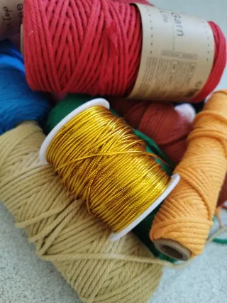 Lote de hilos de macramé en varios colores, perfectos para tus proyectos de manualidades. - Hilo de algodón en tonos pastel y vibrantes. - Hilo dorado metálico. - Variedad de grosores y texturas.