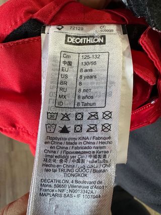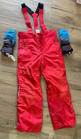 Conjunto de esquí para niño, ideal para disfrutar de la nieve. 8 años. - Mono de esquí rojo con tirantes. - Manoplas azules y negras.