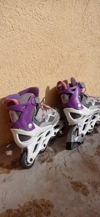 Se venden patines en línea en color morado y gris. - Diseño deportivo. - Cierre de velcro y hebilla. - Ruedas de 80mm. - Número ajustable del 35 al 38.