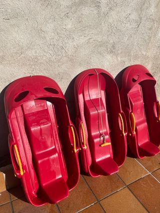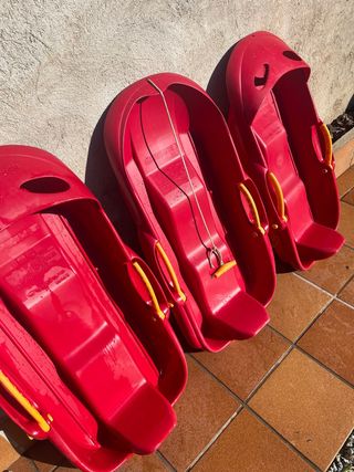 Conjunto de trineos de nieve de color rojo brillante, perfectos para disfrutar del invierno. - Fabricados en plástico resistente. - Diseño ergonómico para mayor comodidad. - Asas laterales para un mejor agarre. - Cuerda de arrastre incluida. Vendo los tres juntos. SOLO CONTACTO POR TELEFONO 690870418