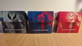 Tres mazos de Commander con n perfecto estado enfundados y con todos tokens y contador de vidas. - Legados Sapientium - Actuación de Prismari - Proclama de Plumargentum No se venden por separado