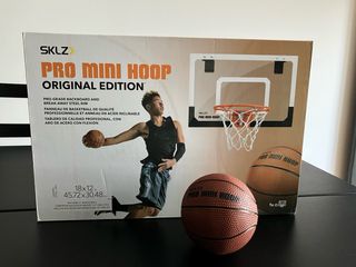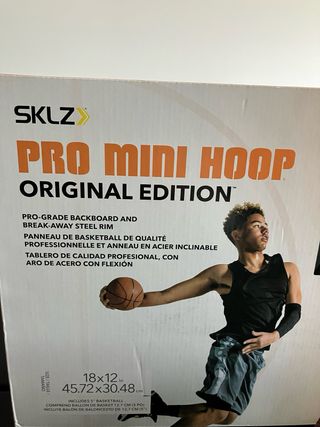 Canasta de baloncesto SKLZ Pro Mini Hoop, edición original. Incluye tablero de calidad profesional y aro de acero. - Tablero de 18x12 pulgadas (45.72x30.48 cm). - Aro de acero con flexión. - Incluye un balón de baloncesto de 5 pulgadas (12.7 cm). Esta sin estrenar. Perfecta para un regalo.