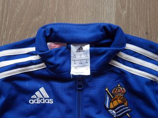 Conjunto de chándal para niño de la Real Sociedad. —Marca: Real Sociedad —Talla: 7-8 años / 128 cm (ver fotos) —Chaqueta azul y pantalón negro con las tres rayas de Adidas en blanco. —Escudo de la Real tanto en la chaqueta como en el pantalón.