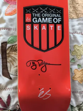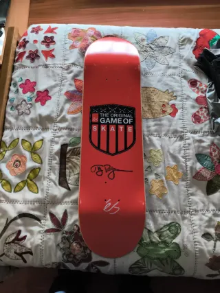 Tabla de skate de la marca ES con diseño The Original Game of Skate. Tg Roger firmada - Color rojo. - Firma de skater. - Logo de la marca ES.