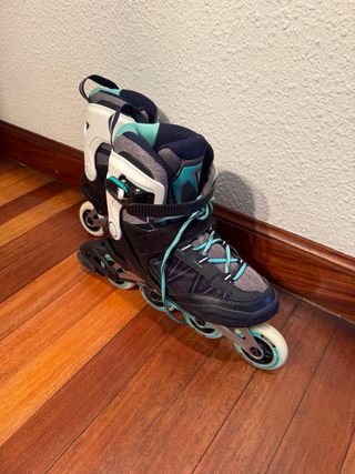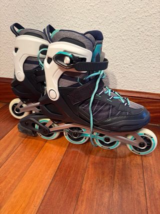 Patines en línea Oxelo Roller Fitness FIT500. - Talla 42. - Diseño en color azul marino, gris y turquesa. - Cierre con cordones, carraca y velcro. - Usados una vez.