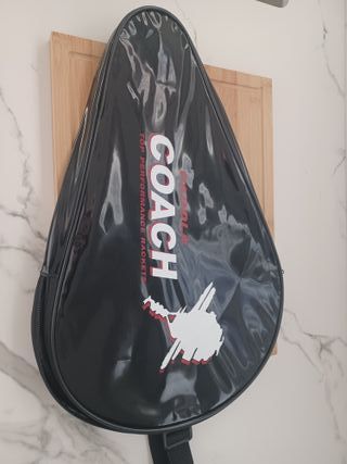 Funda para pala de pádel de la marca Coach. - Diseño en color negro. - Material brillante. - Incluye correa. - Logotipo de la marca en blanco y rojo.