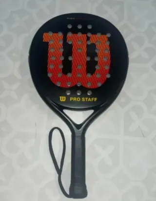 Pala de pádel Wilson Pro Staff. Fibra de vidrio, peso 370 g. y 263 mm. Muy poco uso. - Pala de pádel negra. - Diseño con logo W en rojo y amarillo. - Incluye correa de seguridad negra.