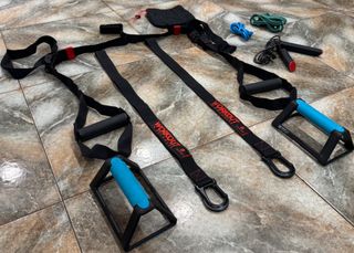 Conjunto de equipo profesional para entrenamiento en casa o gimnasio. - Dos mancuernas para flexiones con mangos azules. - Correas de entrenamiento de suspensión con asas negras. - Cuerda de saltar negra con mangos rojos. - Dos bandas de resistencia, una azul y otra verde.