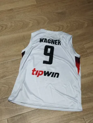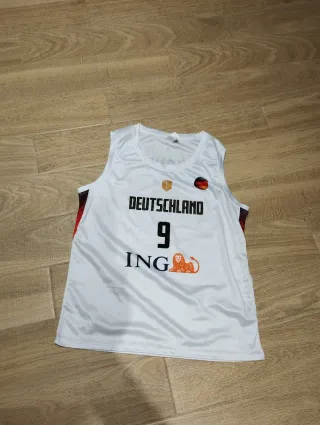 Camiseta de baloncesto de la selección de Alemania, talla L, con el dorsal 9 de Franz Wagner. - Diseño blanco con detalles en negro y rojo. - Logo de la selección alemana. - Patrocinador ING.