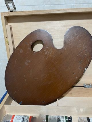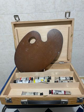 Maletín de madera para pintura con paleta y tubos de óleo. Medidas 36x28x7 - Paleta de madera. - Varios tubos de óleo de diferentes colores.