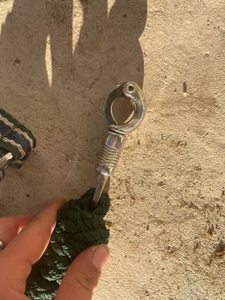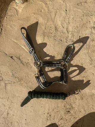 Conjunto de cabezada y ramal para equitación. - Cabezada con rayas azules y verdes. - Hebillas metálicas. - Ramal de cuerda verde.
