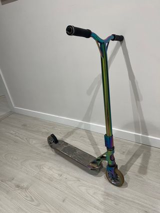 Patinete de estilo freestyle con un llamativo acabado iridiscente. - Manillar con puños negros. - Ruedas de color miel. - Plataforma de metal.