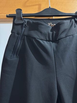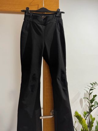 Pantalón de esquí negro para mujer, diseñado para ofrecer comodidad y estilo en la montaña. - Cintura elástica y talle alto. Cierre con cremalleras. - Diseño ajustado con corte acampanado en el bajo. - Largo de la pierna ajustable 2 posiciones: -4 cm y -8 cm. - Sistema de trabillas integradas para añadir tirantes. - Forro elástico en los bajos para cubrir las botas. - Cintura 71 cm, largo 108 cm