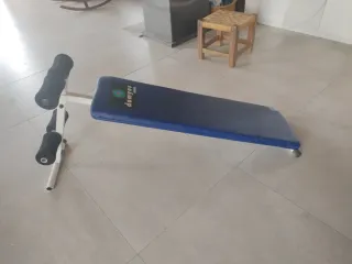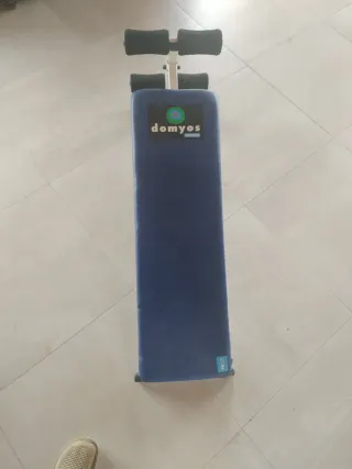 Banco abdominales Domyos en color azul. Es plegable para facilitar su almacenamiento. - Acolchado para mayor comodidad. - Soporte para tobillos. - Marca Domyos.