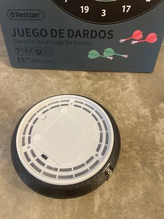 Set de juego que incluye una diana de dardos y un balón de fútbol flotante. - Diana de dardos de 15 pulgadas (36x1.2cm). - Incluye 3 dardos (2 verdes, 1 rojo). - Balón de fútbol flotante con diseño blanco y negro.