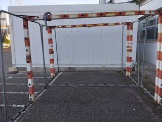 Se venden porterías de fútbol, ideales para entrenamientos o partidos. Medidas: 3 mts de ancho x 1 de fondo, y altura, 2 mts. - Estructura metálica. - Diseño a rayas rojas y blancas en los postes. - Redes y anclajes no incluidos. Disponemos de 4 unidades. Cada par, 150€. El transporte sería a cargo del interesado.