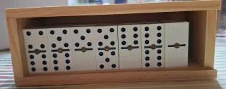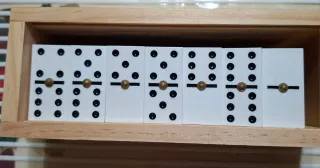 Juego de dominó clásico con una práctica caja de madera para guardarlo. - Piezas de dominó blancas con puntos negros. - Incluye divisor metálico en cada pieza. - Caja de madera para almacenamiento.