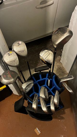 Set de palos de golf de la marca ELTA. - Incluye varios palos de diferentes números y tipos. 14 palos, incluido híbrido TaylorMade 5-24’ - Bolsa de golf azul para transporte.