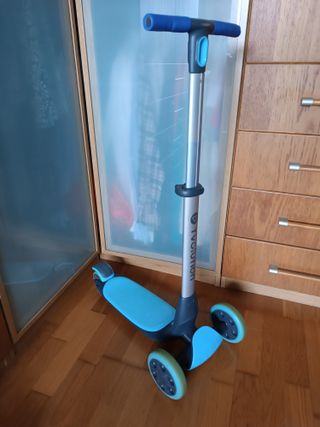 Vendo patinete de tres ruedas para niños Yvolution YGlider Nua, en color azul. - Plataforma antideslizante. - Manillar ajustable en altura. - Ruedas con luces LED. Empuñaduras NO originales, cambiadas por desgaste de las anteriores. Falta una tapa en la rueda trasera. Entrega en mano en Boiro o Noia, o envío por Wallapop. Cualquier duda pregúntame sin compromiso.