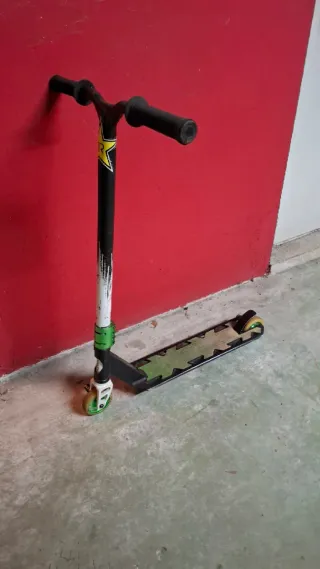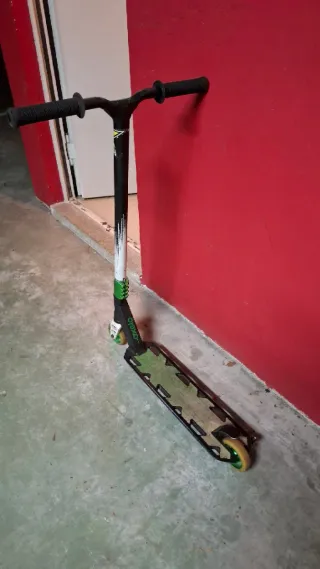 Patinete freestyle con diseño llamativo. - Manillar negro con puños. - Base con diseño verde y negro. - Ruedas delanteras y traseras.