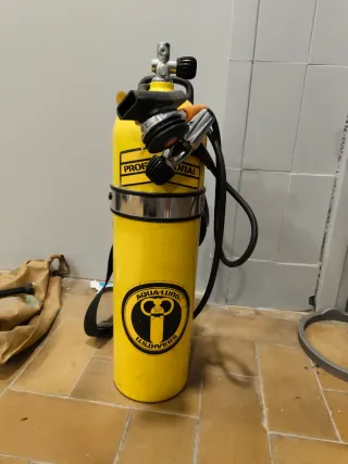 Bombona de buceo profesional Aqua-Lung. - Color amarillo brillante. - Incluye regulador y manguera.