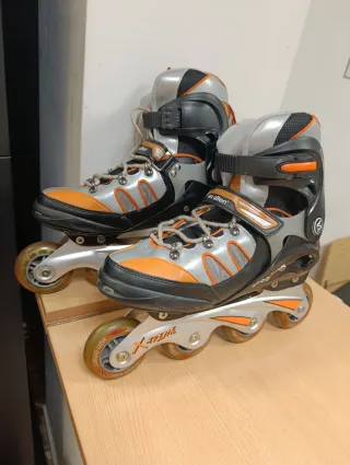 Patines en línea en color gris, naranja y negro. - Talla 44-45. - Cierre de velcro y hebilla. - Ruedas con diseño X-TREME.