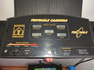 Cinta de correr TENTABLE CARRERA en buen estado, con poco uso. - Pantalla digital con información de distancia, calorías, pulso y tiempo. - Control de velocidad con modos: Warm-up, Fat Burn, Aerobic, Performance. - Botones de subida y bajada de velocidad. - Incluye llave de seguridad.