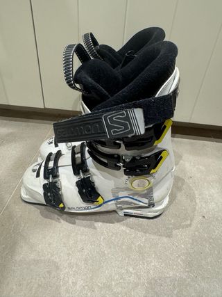 Botas de esquí Salomon para mujer, diseñadas para ofrecer comodidad y rendimiento en la nieve. Talla 25 (para una talla 39-40 también irían bien). Salomon QST, Sport Liner. Access 80w. - Color negro con detalles blancos. - Cierre con hebillas y hebilla trasera que permite andar con mayor facilidad cuando dejas de esquiar. - Interior forrado para mayor calidez. Están muy bien. He usado pero tampoco mucho y bien cuidadas. Tengo también esquís y palos para que puedas tener todo el pack si te interesa, ver mi perfil. Recogida en Puzol (Valencia)