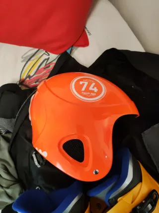 Conjunto de equipo de esquí que incluye un casco y un par de botas. - Casco de esquí de color naranja. - Botas de esquí de color amarillo.