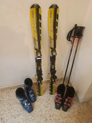 Conjunto de equipo de esquí listo para la montaña. Incluye todo lo necesario para disfrutar de la nieve. - Dos pares de esquís (Atomic 160cm y Rossignol 170cm ). - Dos pares de botas de esquí (Salomon número 33 y otra Rossignol numero 43). - Un par de bastones de esquí. - Un casco talla 56.